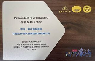 (伊利集團獲民營企業(yè)廉潔合規(guī)創(chuàng)新獎“創(chuàng)新先鋒人物將”的獎牌)
