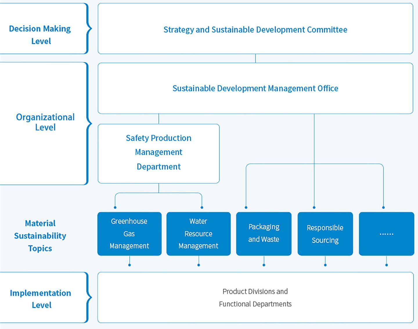 Yili has established a Strategy and Sustainable Development Committee at the board level, which is composed of eight directors (including two independent directors), under the charge of Mr. Pan Gang, the Chairman and President of Yili. Apart from business development strategy, the Committee also focuses on researching and recommending sustainability strategic plans for Yili's long-term development. The Committee also oversees its sustainability strategy implementation across the company (including greenhouse gas management). The Sustainable Development Office is under Strategy and Sustainable Development Committee, which is responsible for the sustainability performance supervision and report to the Strategy and Sustainable Development Committee on a regular basis. The Safety Production Management Department of Yili is responsible for day-to-day management of GHG emissions. The department has a dedicated Carbon Management Director responsible for offering technical support for executing the GHG reduction project across Yili's different business units. The quarterly progress reports are submitted to the Sustainable Development Management Office for review and monitoring purposes.