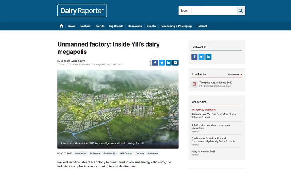 國(guó)際乳業(yè)媒體Dairy Reporter在其題為《無(wú)人工廠:走進(jìn)伊利》的深度報(bào)道中贊嘆道,“很少有乳業(yè)生產(chǎn)基地能讓人聯(lián)想到科幻小說(shuō)中的建筑或者場(chǎng)景,但伊利做到了!伊利不僅為健康谷配備了提高生產(chǎn)和能源效率的最前沿、最先進(jìn)的技術(shù),還突破性地將這個(gè)乳品生產(chǎn)與養(yǎng)殖基地變成了一個(gè)令人驚嘆的旅游目的地。在這個(gè)被稱為‘世界乳業(yè)硅谷’的地方,將工業(yè)旅游融入乳品生產(chǎn)基地成為一個(gè)創(chuàng)舉,該設(shè)計(jì)與伊利構(gòu)建‘透明工廠’的理念相一致,伊利通過(guò)智能制造、高水準(zhǔn)的自動(dòng)化與數(shù)字化等創(chuàng)新科技使其成為現(xiàn)實(shí)。”