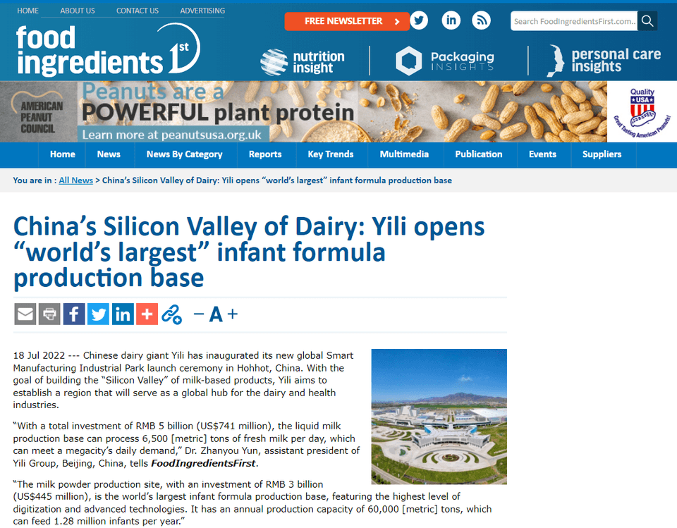 伊利現(xiàn)代智慧健康谷致力于打造全球產(chǎn)能規(guī)模與數(shù)智化應(yīng)用領(lǐng)先、綠色低碳環(huán)保的全球智能制造生產(chǎn)基地。國(guó)際主流食品行業(yè)媒體Food Ingredients First在《中國(guó)乳業(yè)硅谷:伊利建設(shè)“世界最大”嬰兒配方奶粉生產(chǎn)基地》報(bào)道中,對(duì)奶粉全球智造標(biāo)桿基地給予高度評(píng)價(jià),稱其是數(shù)字化水平最高、世界上最大的嬰兒配方奶粉生產(chǎn)基地,應(yīng)用了多種前沿?cái)?shù)字化交互技術(shù),在智能建筑管理系統(tǒng)、設(shè)施管理和控制系統(tǒng)方面處于行業(yè)領(lǐng)先地位。雅虎財(cái)經(jīng)在《“乳業(yè)硅谷”亮相》一文中也表示,伊利以打造“乳業(yè)硅谷”為目標(biāo),致力于打造全球乳業(yè)和健康產(chǎn)業(yè)的中心,為行業(yè)和地區(qū)帶來(lái)繁榮發(fā)展,促進(jìn)區(qū)域經(jīng)濟(jì)增長(zhǎng),加快全球健康產(chǎn)業(yè)發(fā)展。