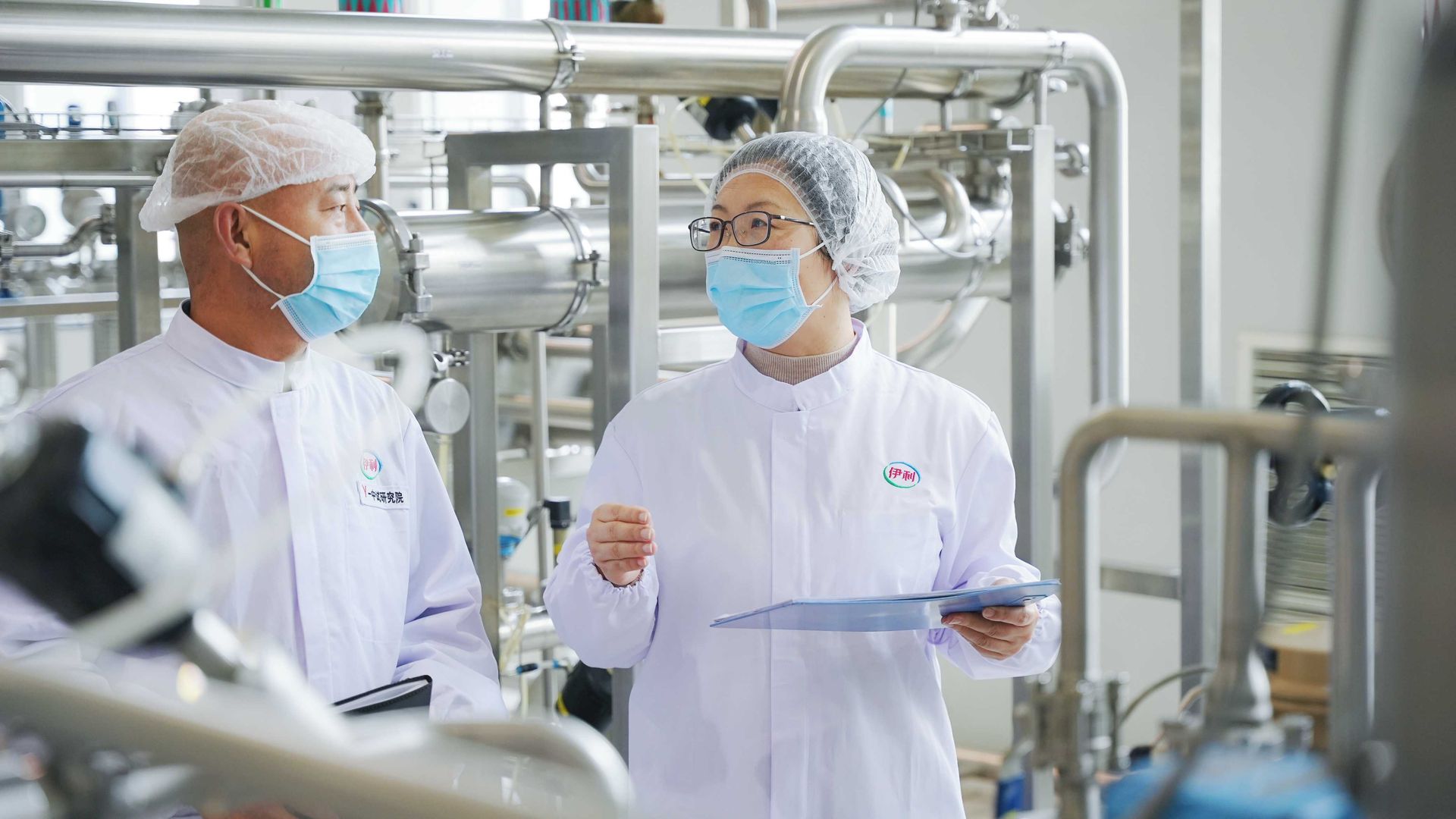 全國人大代表 伊利集團王彩云(右)和同事交流工藝技術(shù)