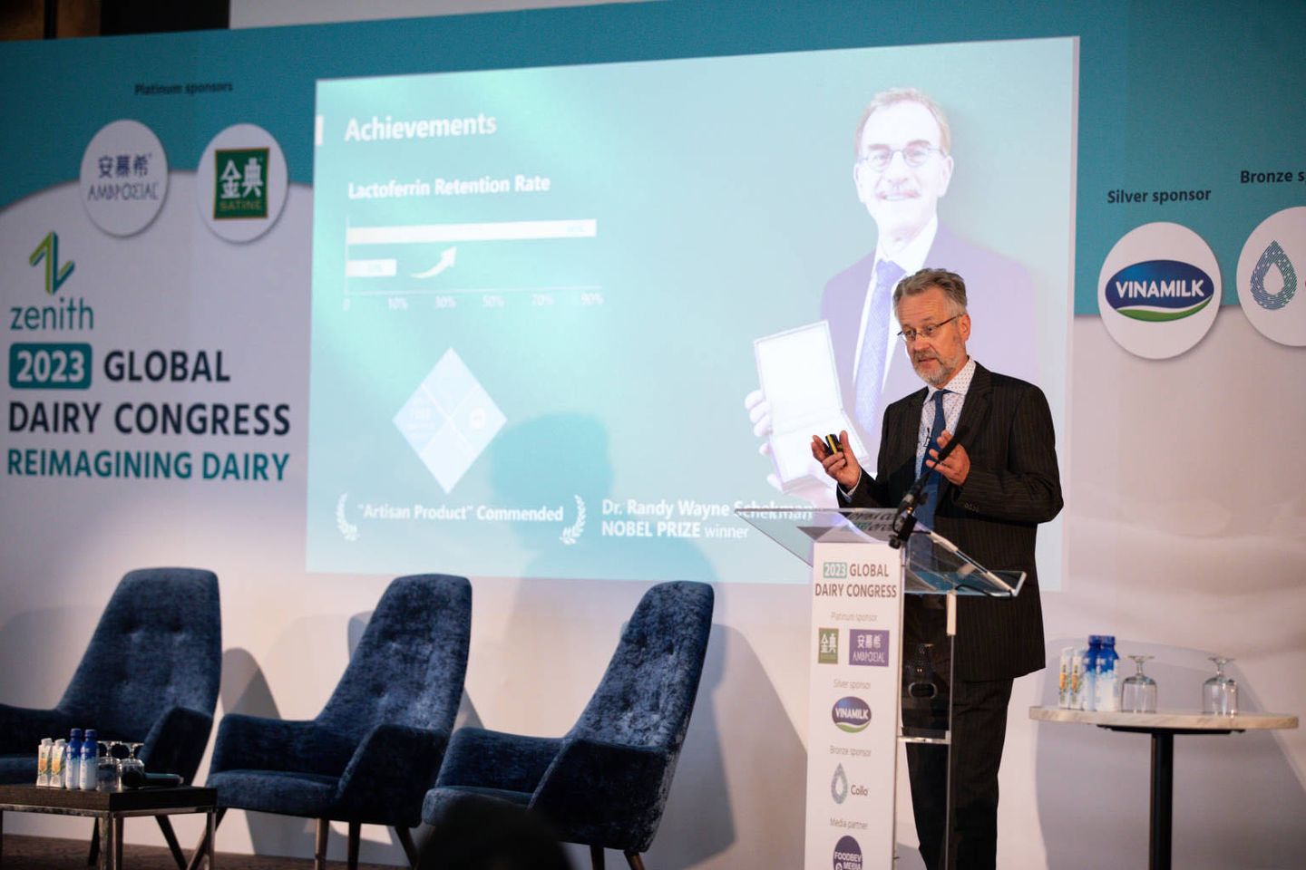 大會現(xiàn)場,伊利歐洲創(chuàng)新中心總監(jiān)蓋瑞特·斯密特博士發(fā)表了《以創(chuàng)新守護全球消費者健康》的主題演講,面向全球行業(yè)分享了金典活性乳鐵蛋白有機純牛奶、安慕希有汽兒氣泡酸奶的研發(fā)歷程與創(chuàng)新技術突破。