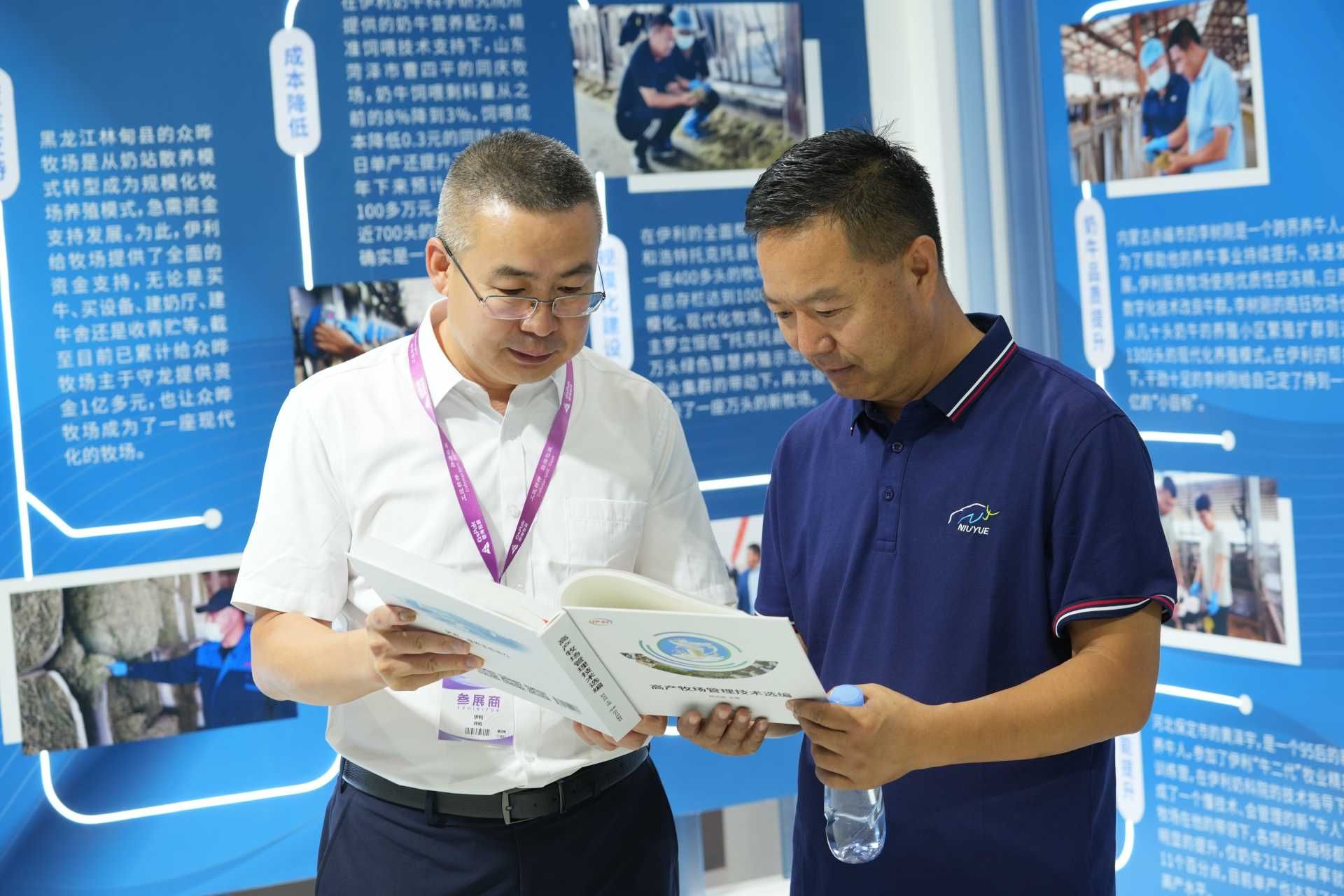 一位參會牧場主在展會現(xiàn)場向伊利奶??茖W研究院技術專家請教養(yǎng)殖管理技術問題