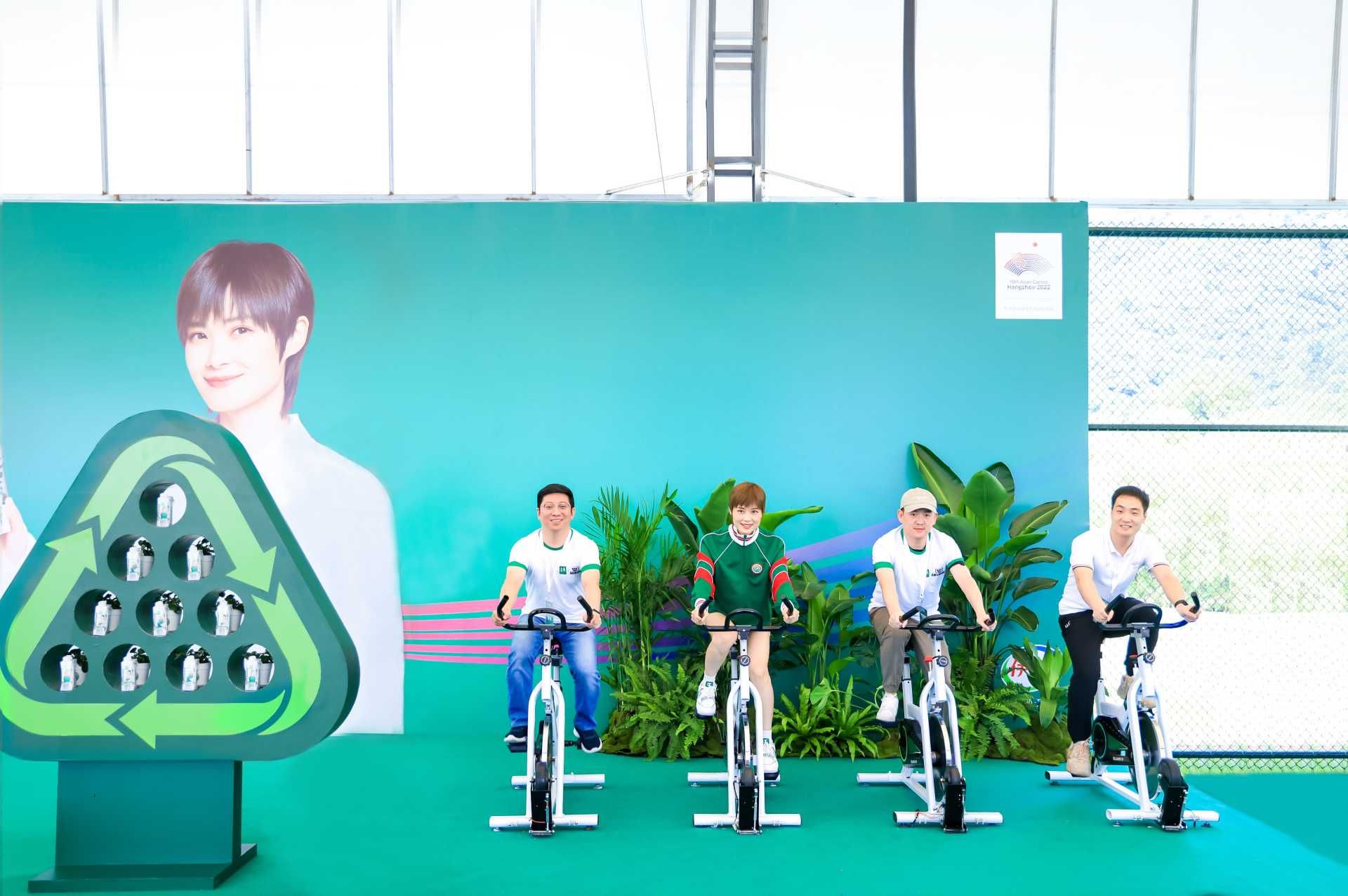新品發(fā)布環(huán)節(jié),金典、天貓、亞組委的嘉賓和金典品牌代言人李宇春一同登臺,啟動發(fā)布儀式。隨著嘉賓緩緩踩動發(fā)電車,低碳循環(huán)的符號在能量匯聚中逐漸被點亮。