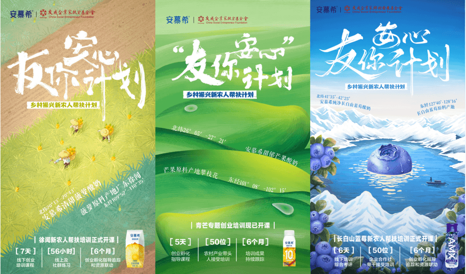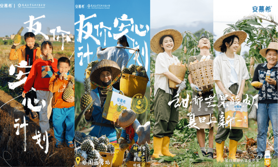 2022年中國品牌日,安慕希在成功打造清甜菠蘿酸奶之后,攜手友成企業(yè)家鄉(xiāng)村發(fā)展基金會重返菠蘿原產(chǎn)地廣東徐聞,發(fā)起“友你安心”新農(nóng)人幫扶計(jì)劃?!坝涯惆残摹庇?jì)劃以安慕希地域水果系列新品開發(fā)為起點(diǎn),陸續(xù)推出清甜菠蘿酸奶、甜郁芒果酸奶、丹東草莓酸奶、新疆哈密瓜酸奶、長白山藍(lán)莓酸奶、修文獼猴桃酸奶、孟連牛油果酸奶七款地域水果口味酸奶,將健康酸奶與地域特色水果相結(jié)合,構(gòu)建了一條品牌與地域經(jīng)濟(jì)共贏的新路徑。